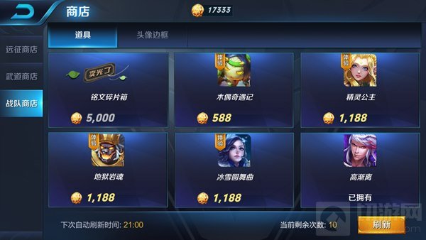 战队商店中会出售各种英雄的皮肤体验卡,每天21点会刷新商店中出售的体验卡,如果不想等也可以直接花战队币进行刷新。如果战队币不够,可以每天进行战队签到,花费钻石,参与对战后会获得战队活跃点,活跃点会在第二天凌晨兑换成战队币,1活跃点数大约可兑换2战队币。