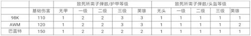 小结:虽然98K的伤害并不如AWM,但是98K的甲修要比AWM低,所以98K能在中远距离一枪打爆任何头盔,而AWM在零距离打英雄头盔时只有96的伤害。在打身体时,98K虽然击杀敌人需要的子弹数同AWM一致,不过98K除了基础伤害比AWM低,其他各等级护甲下的伤害98K都比AWM要高,也就是距离稍微拉远时98K有可能依旧是原来的几枪致死,而AWM可能就需要再多打一枪了。
