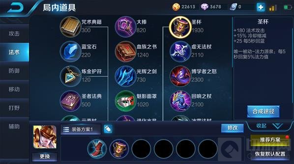解析:鞋子在游戏的前期其性价比是很高的,对于任何一名英雄都适用。女娲自身对于冷却缩减能力的需求远大于法术攻击力的提升,她需要不断的释放技能干扰敌方英雄才能将其控场能力最大化的发挥出来。冷静之靴主要提升女娲的冷却缩减能力,加快其技能释放的频率,同时移动速度的加成进一步提升女娲的支援能力以及机动性。圣杯主要提升女娲的法术攻击力以及冷却缩减能力,与冷静之靴的搭配同时附加铭文的增益效果,可以使女娲在前期就将技能的冷却时间最大化的缩减,对于前中期小规模的团战有很大的帮助,也进一步加强了女娲的收割能力。同时女娲自身对于法力值的需求较大,蓝耗较为严重,这一点在游戏的前期较为明显,极大地限制了女娲的输出能力。而圣杯的被动技能则很好的解决了这个问题,每隔一段时间回复女娲一定量的法力值,加强了女娲的续航能力,减少其回城的次数,逐渐的拉开与敌方英雄的经济差距。