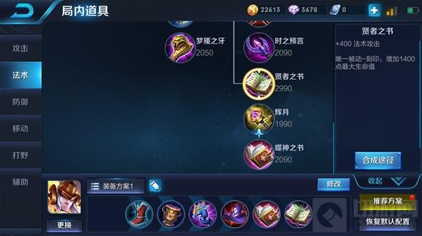 噬神之书主要增强女娲的续航能力,增强女娲的法术攻击力的同时提升法术吸血,依靠其后期极为可观的输出能力,可以源源不断地吸收回复自身生命值。在团战前期不断的消耗敌方英雄时,弥补自身所受的伤害。贤者之书将女娲的法术攻击力最大化的提升,配合游戏中期的装备博学者之怒,将女娲的输出能力最大化的发挥,利用四技能可对敌方英雄造成贯穿性的高额法术伤害。配合短暂的技能冷却时间,可在后期团战中不断释放,收割能力发挥至极致。同时贤者之书给予了女娲额外的最大生命值加成,加强了其生存能力,避免被敌方英雄在后期团战中乘虚而入。