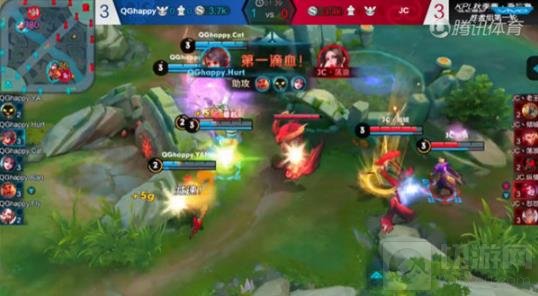 比赛进行到一分多钟的时候,红色方多名英雄又集体去反红,上路的曹操见状赶紧前往支援,并释放一技能加快支援的速度。百里玄策的二技能命中了野怪时却误以为命中了敌方英雄,在突进的时候反而受到了重创。而不知火舞在突进人群打出控制和伤害的时候被太乙真人的一技能所眩晕,接着便被李元芳秒杀。红色方状态较好的哪吒进场成功击杀了太乙真人并辅助队友击杀了苏烈。红色方在取得优势后还选择继续突进,却被貂蝉使用一技能成功消耗,这时候鬼谷子和百里玄策均已是大残,李元芳趁势追击并将其击杀。赶到支援的曹操直接拦住了哪吒的追击,掩护李元芳顺利撤退。接着曹操使用一技能追击并用二技能成功将哪吒击杀,收拾了残局。