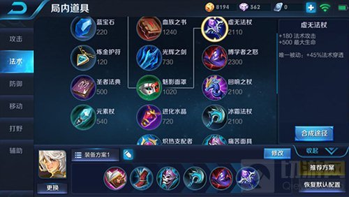 六神装:噬神之书、冷静之靴、痛苦面具、冰霜法杖、博学者之怒、虚无法杖