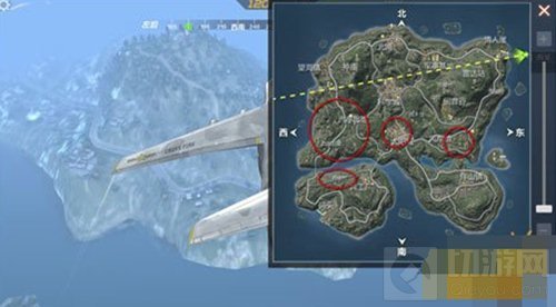 四排情况下首先我们应该排除掉航线上方的大建筑群,这种离航线非常近的建筑群想都不用想肯定是人最多的,就算是后方的望海镇也不应该选择。因为四排的情况下人都是一群一群降落的,很可能就是商量好在航线的最后降落。比较推荐的大型建筑群是回音谷、风车镇、太阳城,伴山镇的位置太远了可以不考虑。