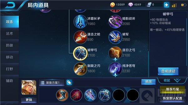 中期第二件装备出破甲弓,一般敌方的坦克英雄在中期都有了不俗的坦度,后羿在中期需要出破甲弓,在团战时候后才能打出伤害,破甲弓给予后羿一定物理攻击力的加成以及冷却缩减能力,搭配冰痕之握使得后羿释放技能消耗的频率更快,破甲弓的唯一被动增加物理护甲穿透,能够更好的输出敌方肉坦英雄。