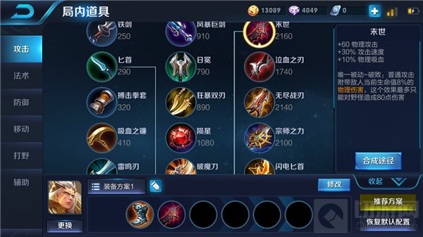 前期第二件装备出末世,末世是后羿在整个游戏中的核心装备,也是为后羿在后期能够出半肉装的基础,末世是在整个攻击装里面性比价很高的一件装备,末世提供物理攻击以及攻击速度和物理吸血,为后羿在前期带来不错的收益,兼顾了后羿的输出能力和续航能力,让后后羿在对线时更轻松,破败的唯一被动是普通攻击附带敌人当前生命值的一定百分比的物理伤害,强化了后羿在前期的普攻伤害。
