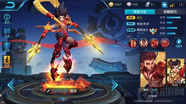 一技能-火焰三尖枪:哪吒攻击四周的敌人,并造成物理伤害,每击中一个敌人都会触发一次风火轮效果,当哪吒触碰到风火轮时会在短时间内提升自身移速(可叠加,有上限)。