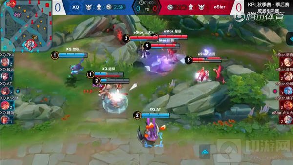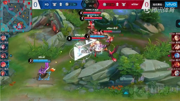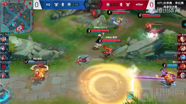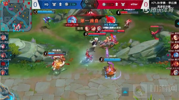 在一场XQ与eStar的比赛中,双方在下路发生了一波团战,此时eStar的诸葛亮入场,先是用自己的二技能命中了花木兰,而后利用自己的一技能贴脸攻击花木兰,并将其打成残血,此时的诸葛亮成功的触发了被动法球,带着自己的被动法球,诸葛亮利用二技能拉近自己和花木兰之间的距离,随后利用被动法球将花木兰成功的击杀,拿到了本场比赛的第一滴血。