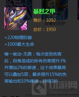 点评:现射手复活节被削,除了复活甲我们还可以选择暴烈之甲。暴烈之甲不仅提高护甲和生命值,还提供输出和移速,15%输出的加成相当于一把小破军了。对于现版本的后羿、明世隐、程咬金等特别适合,暴烈之甲的后羿,不仅肉还跑得快,输出也高。