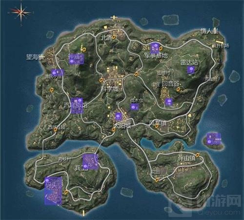 1.想要在120人模式中3600万平方米的地图中找到这些稀有武器,拾取难度完全是大海捞针一般,那么这些武器在地图中都是有一定分布区域的,在图中的紫色标记中,每一个地方的紫色标记就是重要物资的随机刷新点,也就是说在这些地方就有可能找到M4A1-四倍镜、AK47-四倍镜、MK5-二倍镜这些稀有武器。