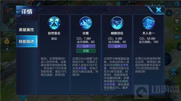 庄周每隔一段时间进入自然梦境,会解除自身所有控制效果,并且减少所受到的伤害,增加移动速度。被动效果无疑提升了庄周的生存能力。】