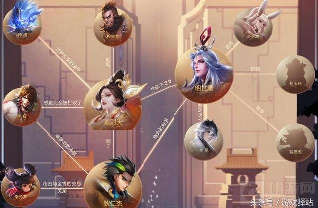 小编将显示单个英雄的关系描述整合到了一起,可以看到李元芳和狄仁杰是金钱和秘密的交易关系,李白和狄仁杰则是艺术家和城管的关系等等,而明世隐除了是奕星的导师外还是其余几位的首领,以上这些关系或多或少都在背景故事中有所提及!