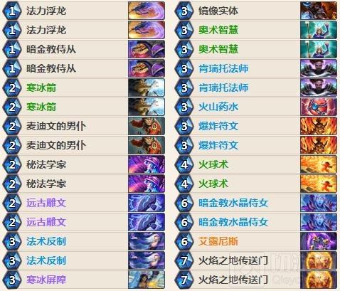 如上图所示,第一套是奥秘法比较常见的形态,配有哀绿、火门、远古雕文等等,这套奥秘法在狗头人版本初期确实很好用,不仅自身强度够高,而且有效克制宇宙牧。但是随着版本逐渐变化,这套卡已经不能很好的对付节奏贼和快攻骑了,甚至连各形态的术士都很难对付。整体来说这套偏控场的奥秘法只适合针对宇宙牧和恶毒龙牧,连带低费法术的心火龙牧都不一定打得过。