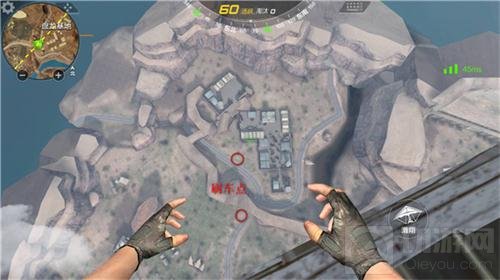 最好是降落在上面的建筑里,因为上面建筑相对于下面的建筑有一个高度差,更好一些,可以更好看见下面的情况。