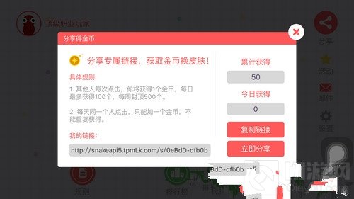 在分享界面有具体的分享和金币的获取规则:其他人每次点击,你将获得1个金币,每日最多获得100个,每周封顶500个。