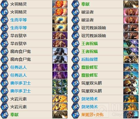 第二套卡组是快攻骑,这套卡组的核心是铺场,带上了特别多的能够从铺场收益的随从,比如任务达人、腐肉食尸鬼、诅咒教派领袖、霜狼督军、后院保镖,配合火羽精灵、火岩元素、旱谷狱卒等可以提供额外随从的手段,它们能发挥更大的作用。此外,这套卡组还带上了很多buff以及莱妮莎炎伤,可以继续扩大优势。除此之外,这些buff牌还能保护关键随从,保证更多的输出。