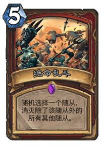 绝命乱斗是一张非常有意思的AOE,和其他大部分AOE法术的伤害稳定,能够直接判断是否能清场不同,绝命乱斗看中的是运气,你既有机会己方一个小虾米1打7存活下来,也可能刚好留下对手最难解的随从。不过对于战士大部分都是全场打一,或者比较依赖配合清场的其他AOE来说,绝命乱斗倒是最为简单直接。