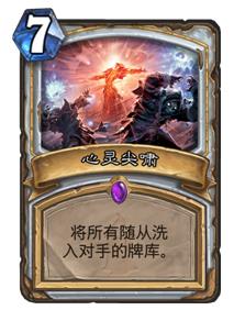 牧师之所以现在能够在天梯和竞技场双料称霸,这张AOE的功劳可谓不小。和同样清全场的扭曲虚空作为对比,心灵尖啸不仅费用更低,还能够搞定亡语随从,此外,污染对手的牌库也是其较重要的作用,至于疲劳的问题,现在的对局基本上都拖不到疲劳回合了。因此不管再被动的场面,都可以用此卡一卡搞定,这可是任何其他AOE都做不到的,10费回合还能给自己留3费站场。有了这卡,想必安度因也一定在暗地里偷偷地“奸笑”吧。