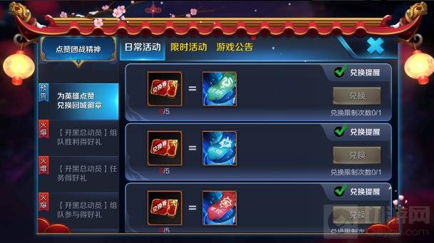 在游戏中通过为英雄点赞就可以获取团战精神兑换券,没周点赞只能获取1个团战精神兑换券,收集5个团战精神兑换券就能够兑换一个永久回城特效了。