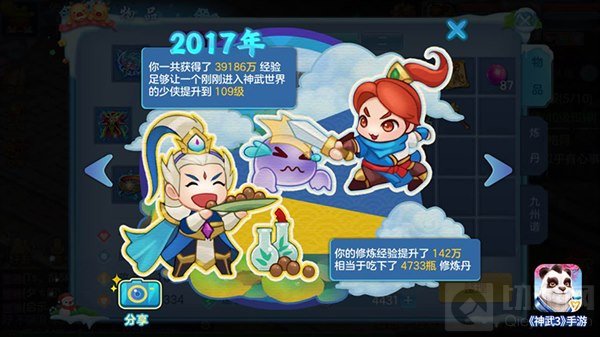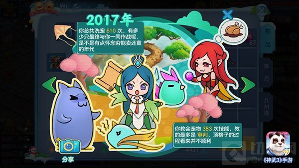 宠物是你最贴心的合作拍档,2017年你总共洗宠610次,有多少只最终与你一同战斗呢;你教会宠物383次技能,教的最多是“审判”,顶格子的过程看来并不顺利。赚取经验是你孜孜不倦的追求,2017年一共获得39186万经验,足够让一个刚刚进入神武世界的少侠提升至109级;你的修炼经验提升了142万,相当于吃下了4733瓶修炼丹。