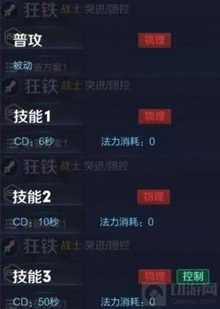 狂铁,定位战士,特长是突进和团控,官方建议位置是上单。感觉和夏侯惇,达摩之类差不多。