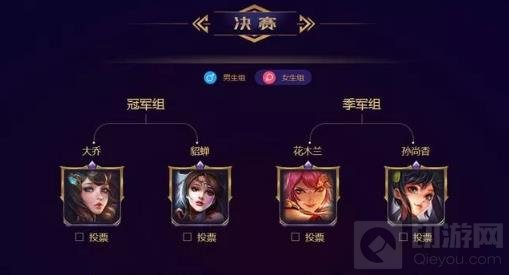 王者荣耀2017年度英雄人气总决选已经正式结束,李白、诸葛亮进入了男生组总决赛,而貂蝉、大乔则进入女生组总决赛,经过一番激烈的投票选举,男生组和女生组的冠军已经诞生。快来和切游小编一起来看看吧。