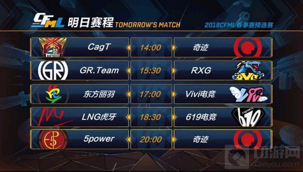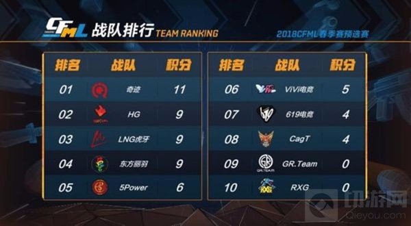 昨天是CFML春季预选赛的第三个比赛日。随着扣人心弦的比赛的进行,各战队的积分排名逐渐清晰。奇迹战队未尝一败领跑积分榜,HG、LNG、东方丽羽同样积9分紧随其后。RXG、GR战队一场未胜排名垫底。今天的五场比赛分别由HG对阵Vivi,奇迹对阵619,5power对阵LNG,CagT对阵HG,GR对阵奇迹。各队表现如何,一场混战已经上演。