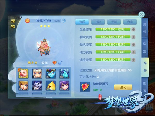 而对于资质更高的仙兽、神兽来说,各位侠士可以通过收集神兽祝福石为神兽提供进化机会!通过神兽祝福石进化的神兽同时会少量增加一定的成长率,各种资质也会得到稳定显著的提升!全面进阶的能力相信会助阵各位侠士的战斗,让侠士在梦想大陆一鸣惊人!
