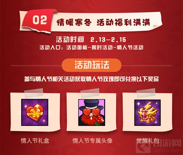 情人节玫瑰送出的数量将按照玩家达成条件的相应程度而各有不同,而使用数量不同的情人节玫瑰则可以兑换不同的奖品:情人节礼盒、情人节专属头像或者觉醒礼包。