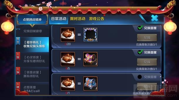 1个甜蜜巧克力:兑换情人节小礼包,打开后可得3钻石或3铭文碎片。