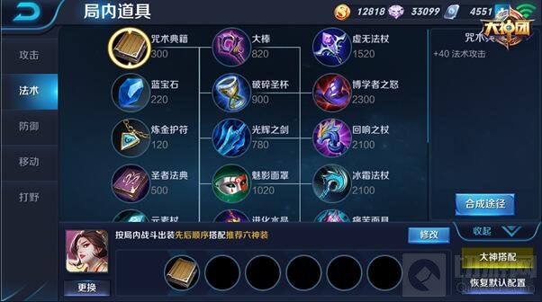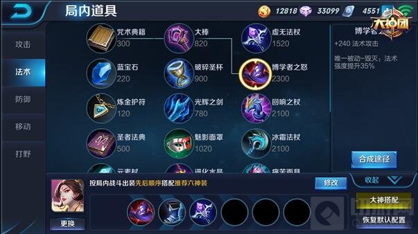 中期装备的选择对后期的战局发展较为重要,高攻击流出装先选择虚无法杖作为武则天首件输出装,虚无法杖可以增加较多的法术攻击和法术穿透能力,前期让武则天的技能可以更好的压制对手,同时虚无法杖价格较低,适合首发出装;选择出大棒合成博学者之怒,该装备的固定属性增加武则天较多法术攻击,被动效果更增加整体35%法术强度百分比,让武则天的技能输出更高;鞋子选取秘法之靴,增加法术穿透能力让武则天的法术攻击对敌人造成更高的伤害。