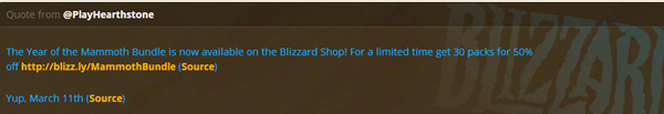 为了纪念猛犸年,我们在商城中添加了全新的猛犸年合集!你可以使用128元的价格购买30点奥术之尘获赠一份猛犸年合集,内含总计30包卡牌包——猛犸年发布的各个扩展包分别有10包。玩家现在可以在《炉石传说》游戏内商城购买猛犸年合集。请注意,每个账号只能购买一次猛犸年合集。