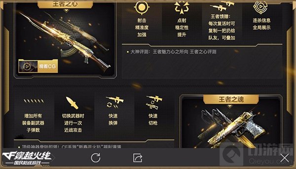 此次上架的三把王者系列武器都是由特殊材料制成,金银相间的身体上刻画着代表至高无上权力的龙,尊贵大气,是全世界最高等级佣兵的身份象征。武器外观方面,龙身、龙头和龙爪三种元素在王者之心的设计上得到完美结合。武器属性方面,王者之心拥有超高的射击精准度和更加稳定的点射能力。武器特效方面,王者馈赠技能可以让使用者在每次复活时复制一把王者之心给队友使用。