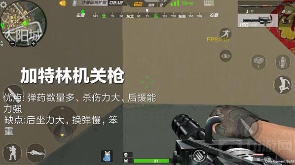 加特林准心固定,弹道垂直,打起来集中度相当高; 容纳的子弹数量可以达到150单发的标准值,弹药充足耐损耗。可惜的是,加特林本身重量大,换弹速度极慢,较强的后坐力极大影响到整把枪的稳定性。如果要使用这把枪,一可以来到房子里当伏地魔,找到房间墙角或楼梯缝隙之类的隐蔽地区蹲点,等敌人冲上来之后再乱枪解决; 二是坐在队友的吉普车上,保持站立姿势后对着旁边出现的敌人和移动车辆狂扫,这样可以清理更多威胁自身安全的对手; 三是来到僵尸房,利用其弹药丰富的特点刷分,提高团队模式里的分数的奖励。这三种打法总体来说都能够最大发挥加特林的长处。