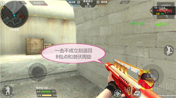 在开局后,保卫者通过B包点向潜伏者家前前顶,注意过程中需要有足够的火力进行压制,否则会被潜伏者打个措手不及。当来到此地后在图示位置蹲点,潜伏者将没有任何的可能突破。