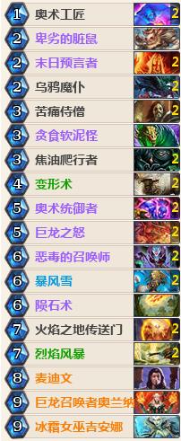 上面列出的这套卡组,我打到了2级,还是很强力的,里面有些卡是狗头人版本的新卡,还是有些用处的,当然还有很多别的搭配,我们都可以尝试一下,不过我觉得高费法术是这套牌的核心体系,所以乌鸦魔仆和奥术工匠可以有一个不错的发挥,3个高质量的橙卡也还不错,不过高费法术的数量不固定,你们可以都试一下。