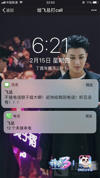 电视剧热播更不忘为《神武3》打call,在送上节日问候的同时,更询问大家是否收到他送出的新年红包。当“喂,我是黄子韬”的磁性声音响起,阳光帅气的韬师兄又回到了大家身边;“呀,接错电话了”恍然大悟式的惊讶,蠢中带萌的飞总附体,一秒撩翻少女心。多重角色无缝切换,带你领略韬师兄的暖萌可爱。