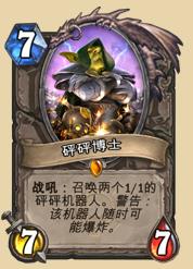 自古7费及以上的橙卡,即便效果再牛,也很难有高出场率,更不必说要达到砰砰博士这样人手一张的程度,几乎是“前无古人后无来者”。砰砰博士除了自身77的场攻威胁以外,主要是他的两个“蛋”,对手害怕各种被炸“崩”,几乎不敢轻举妄动,一般砰砰都死的比蛋早,蛋都是自己卖的,这个级别的威慑足矣证明砰砰的蛋是变态的存在,不然也不至于3费王牌盛行的年代依然人手一张砰砰博士。
