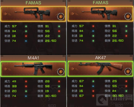 在威力和换弹上差距较大,但其它数值高于AK。近距离扫射的作战能力可能不如FAMAS,但是拉开距离后中近距离由于FAMAS的稳定性高于AK,AK47会感觉很吃力。