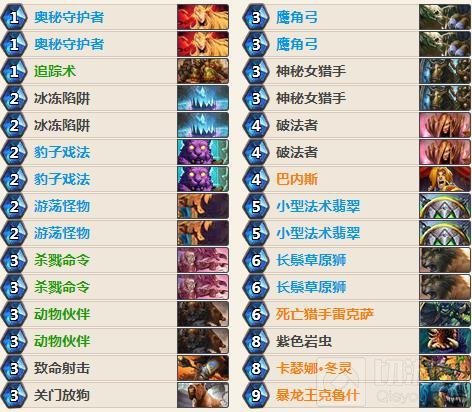 我们起手找奥秘守护者、神秘女猎手、巴内斯,可以留豹子戏法、游荡怪物,动物伙伴、小型法术翡翠也可以留。对上快攻卡组时可以留鹰角弓、冰冻陷阱;对上控场卡组时可以留一张追踪术,要是有巴内斯的话可以留破法者,降低它复制出无特效随从的概率。