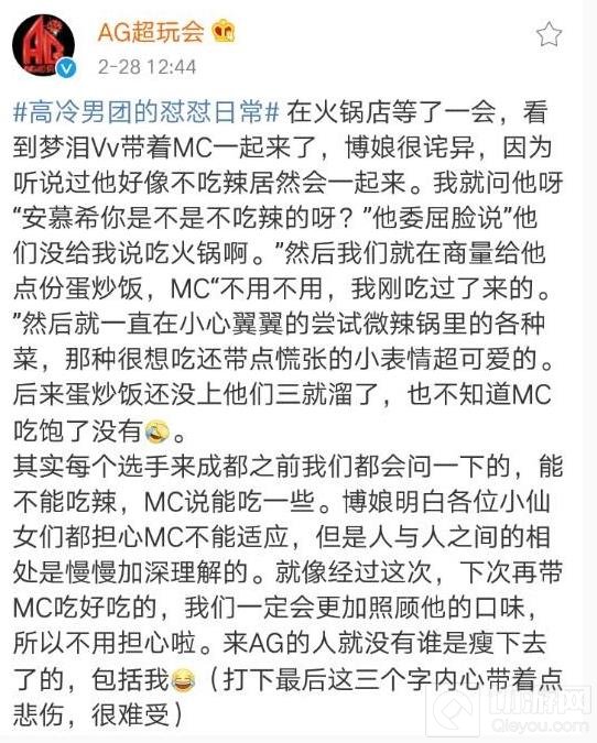 不过虽说粉丝关怀心切,我们AG的小哥哥们却也是超级细心的小棉袄啦~博娘更是发表微博为各位小可爱还原当时情况,高冷男神团在一起的日常超级暖萌~大帅也是超级可爱!以及博娘最后一句……大帅估摸着是不会瘦啦!