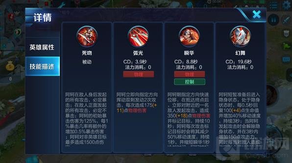 阿轲在敌人身后发起的进攻必定是暴击,在敌人正面发起的进攻,都不能产生暴击效果。该技能奠定了阿轲的位置是刺客英雄,使得她在前期就拥有非常强的gank能力。