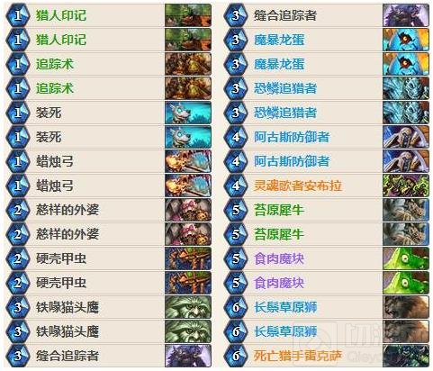 我们起手找慈祥的外婆、硬壳甲虫、蜡烛弓。对上快攻卡组时可以留一张装死,配合慈祥的外婆能打出不错的效果,猎人印记也可以留,能清除一些前期高威胁随从;对上控场卡组时我们要留追踪术、缝合追踪者,魔暴龙蛋可以和假死一起留。