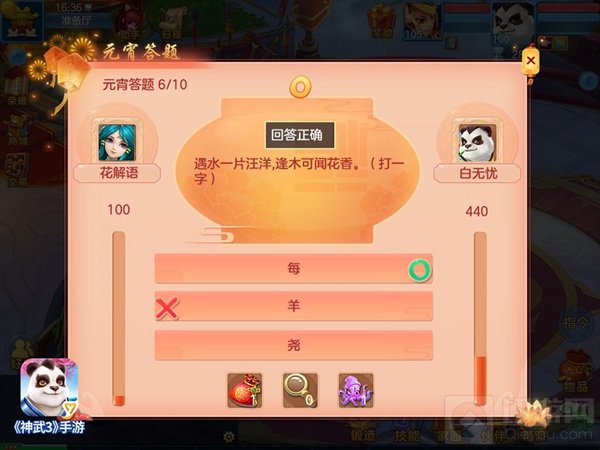 火树银花贺佳节,欢天喜地闹元宵。赏花灯、猜灯谜是元宵节必不可少的传统习俗。活动期间,少侠们可两两匹配进入灯谜答题界面,连续答题获得积分,最后活动积分最高者获胜。想要展现自己的聪明才智吗?想要挑战自己的知识储备吗?《神武3》手游元宵灯谜大会火爆来袭,全新体验马上开启!