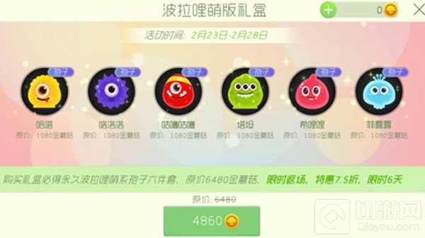 球球大作战波拉哩家族系列孢子限时返场,春节活动期间可以在魔法屋中使用金蘑菇购买六件套礼盒,价值4860个金蘑菇,可以省1620个金蘑菇哦!