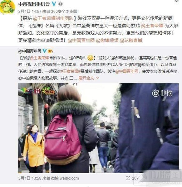 3月1号,中国青年网发布了一篇视频,探秘王者荣耀幕后制作团队,随后中青讯手机台微博也进行了转发,该视频仅上线两天,播放量超过十万。中国青年网对《王者荣耀》幕后制作团队进行了采访和了解。