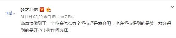 “事情做到一半”“坚持与放弃”等字词像极了现在梦泪所处的环境,与自己多年并肩作战,共同追逐梦想的兄弟选择了离去,自己真的还要坚持下去吗?真的坚持下来也有可能只是梦一场而已。从如此极具暗示性的话语我们可以读出写出这段话时,梦泪心中对于前方道路的迷茫,所以这可能才是他会用如此隐晦的话语来渴求网友们回答的原因吧。
