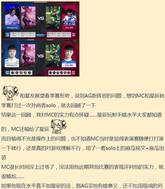 而随着2018KPL春季赛3月21日开赛时间的公布,网友们开始讨论起新赛季各大KPL战队的表面实力对比。这时有网友就发现,作为许多AG超玩会粉丝寄予厚望的MC在历次出现的赛场表现并不让人满意,甚至说有点弱。理由就是在秋季赛与星辰打孙尚香solo的时候输了,而星辰在多数网友看来并不是很强的射手,这让楼主对于MC在超玩会的作用打上了一个大大的问号。