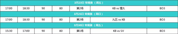 随后的第二周期比赛中,KB将先后遭遇情久、九五以及SV。这三支队伍,KB在上赛季中皆有交手,最终都是以胜利结束。不过在这赛季中,四支队伍的阵容变化,令胜负不知如何走向。同时小9能够保持自己较好的状态,继续在这三场比赛中上场也有待考证。面对这三支队伍,KB极有可能选择老将酷本上场带领团队打出更多样的战术。