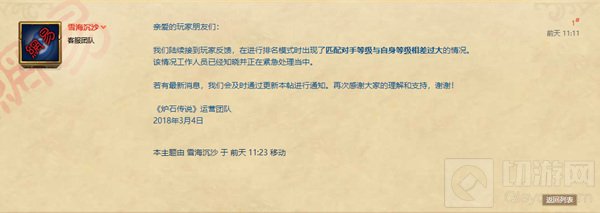 以上就是炉石传说官方已注意 排名模式匹配对手等级异常的全部内容了,更多炉石传说内容请关注切游网炉石传说专区。