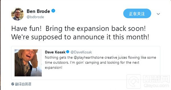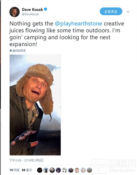 炉石传说游戏设计师Dave Kosak发推文表示,自己已经向野外出发,寻找炉石的下一份资料片。照片中看到他戴着厚帽子和手套,前面还有一团雾气。